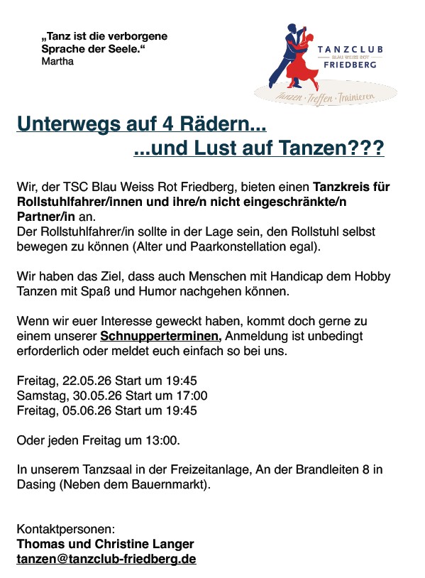 Der TSC Blau Weiss Rot Friedberg bietet einen Tanzkreis für Rollstuhlfahrer/innen und ihre/n nicht eingeschränkte/n Partner/in an. Wir haben das Ziel, dass auch Menschen mit Handicap dem Hobby Tanzen mit Spaß und Humor nachgehen können. Wenn wir euer Interesse geweckt haben, kommt doch gerne zu